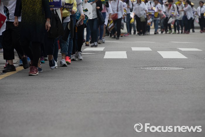 (서울=포커스뉴스) 23일 오후 서울 중구 시청광장 인근에서 보육관계자들이 '어린이집 0~2세 맞춤형보육 제도개선 및 시행 연기'를 촉구하며 가두행진을 하고 있다.