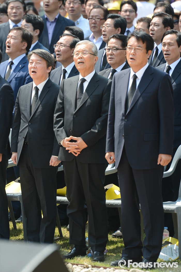 (김해=포커스뉴스) 23일 오후 경남 김해 봉하마을에서 엄수된 故 노무현 전 대통령 서거 7주기 추도식에 참석한 정진석(앞줄 오른쪽부터) 새누리당 원내대표, 김종인 더불어민주당 비대위 대표, 안철수 국민의당 상임공동대표,가 애국가를 부르고 있다.
