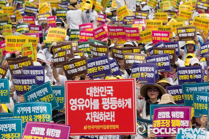 (서울=포커스뉴스) 맞춤형보육제도의 시행을 막기 위해 전국의 보육교사 1만5000여명이 서울광장에 모였다.