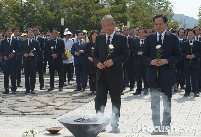 (김해=포커스뉴스) 23일 오후 경남 김해 봉하마을에서 엄수된 故 노무현 전 대통령 서거 7주기 추도식을 마친 뒤 김종인(왼쪽) 더불어민주당 비대위 대표, 우상호 원내대표가 묘역 참배 및 헌화를 하고 있다.