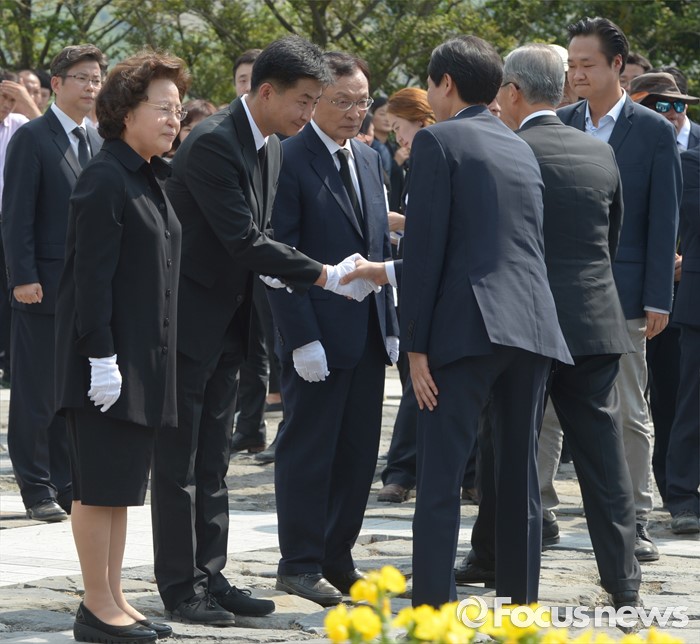 (김해=포커스뉴스) 23일 오후 경남 김해 봉하마을에서 엄수된 故 노무현 전 대통령 서거 7주기 추도식을 마친 뒤 노 전 대통령 부인 권양숙(왼쪽부터) 여사, 장남 건호 씨, 이해찬 노무현재단 이사장이 묘역 참배 및 헌화를 마친 우상호 더불어민주당 원내대표, 김종인 비대위 대표와 인사하고 있다.