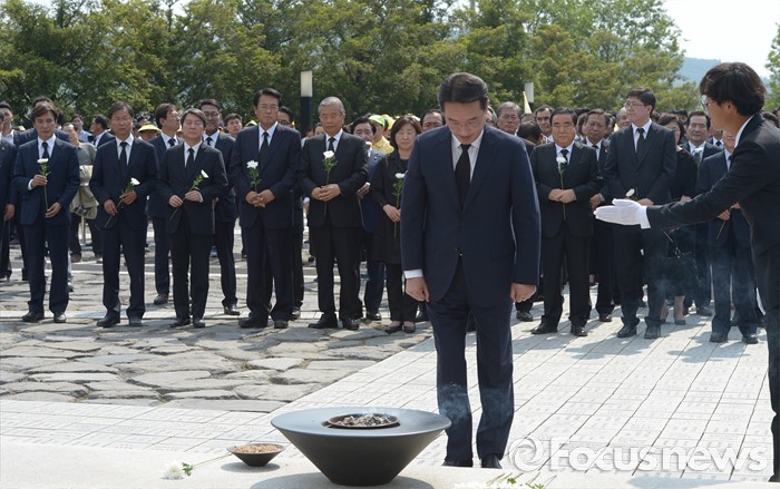 (김해=포커스뉴스) 23일 오후 경남 김해 봉하마을에서 엄수된 故 노무현 전 대통령 서거 7주기 추도식을 마친 뒤 현기환 청와대 정무수석이 묘역 참배 및 헌화를 하고 있다.