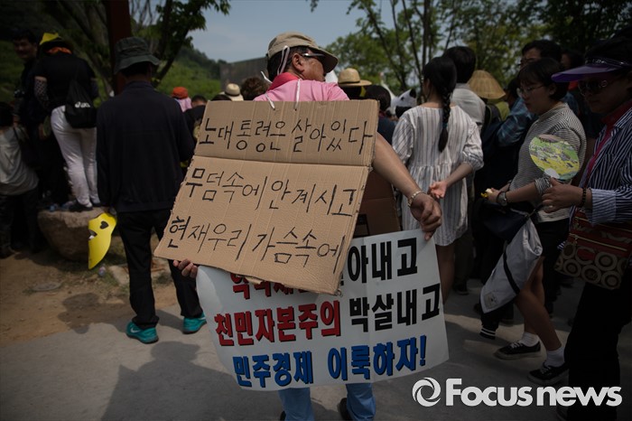 (김해=포커스뉴스)故 노무현 전 대통령 서거 7주기인 23일 오후 경남 김해시 진영읍 봉하마을에서 열린 '故 노무현 전 대통령 서거 7주기 추도식'에서 한 추도객이 '노 대통령은 살아 있다. 무덤 속에 안 계시고 현재 우리 가슴속에'라는 글이 적힌 종이 옷을 입고 있다.