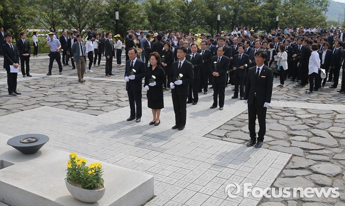 (김해=포커스뉴스) 23일 오후 경남 김해 봉하마을에서 엄수된 故 노무현 전 대통령 서거 7주기 추도식을 마친 뒤 노 전 대통령 부인 권양숙 여사와 장남 건호 씨 등 참석자들이 묘역 참배 및 헌화를 하고 있다.