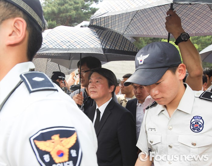| △ 우산 경호 속 추도식장 나서는 안철수 |