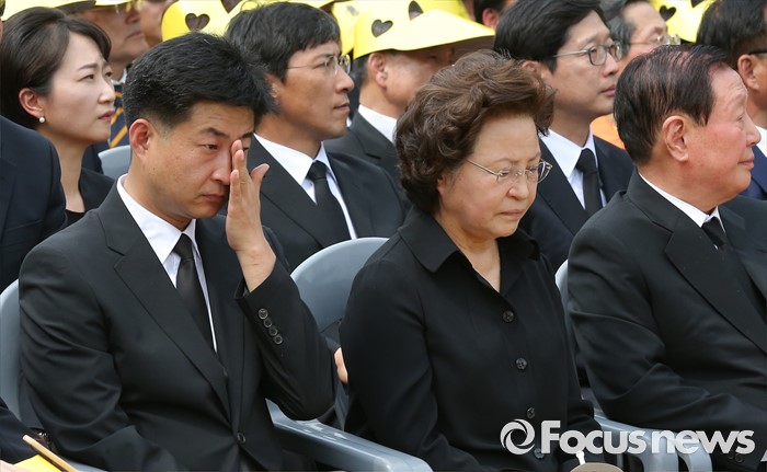 (김해=포커스뉴스) 23일 오후 경남 김해 봉하마을에서 엄수된 故 노무현 전 대통령 서거 7주기 추도식에 참석한 노 전 대통령의 장남 건호(왼쪽) 씨가 눈물을 흘리고 있다. 가운데는 부인 권양숙 여사, 오른쪽은 김원기 전 국회의장.