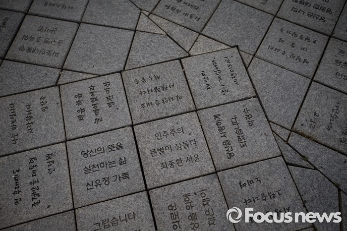 (김해=포커스뉴스)故 노무현 전 대통령 서거 7주기인 23일 오후 경남 김해시 진영읍 봉하마을 노무현 전 대통령의 묘역에 그를 그리워하는 글귀들이 바닥에 적혀 있다.