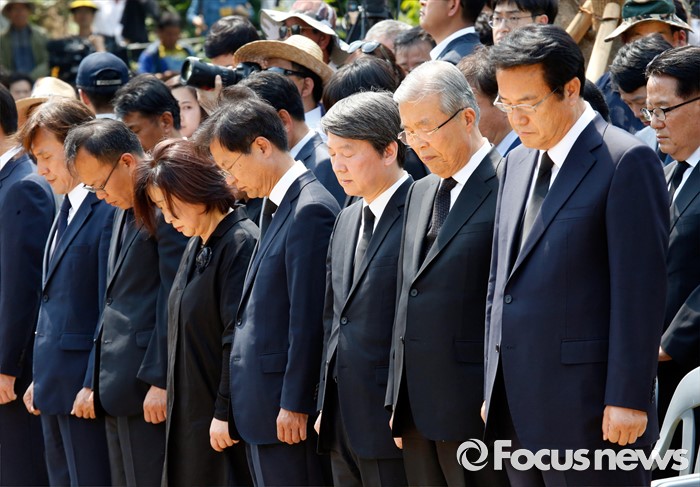 (김해=포커스뉴스) 23일 오후 경남 김해 봉하마을에서 엄수된 故 노무현 전 대통령 서거 7주기 추도식에 참석한 내빈들이 묵념을 하고 있다. 앞줄 오른쪽부터 정진석 새누리당 원내대표, 김종인 더불어민주당 비대위 대표, 안철수 국민의당 상임공동대표, 천정배 공동대표, 심상정 정의당 상임대표, 나경채 공동대표, 김민석 민주당 대표.