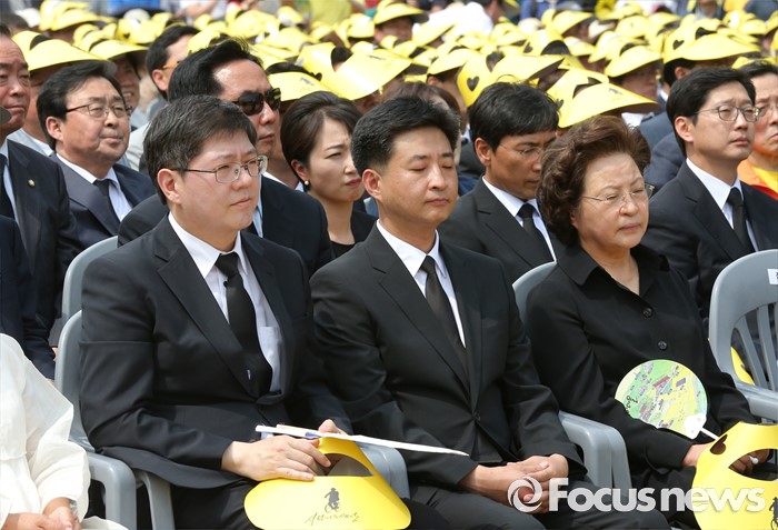 (김해=포커스뉴스) 23일 오후 경남 김해 봉하마을에서 엄수된 故 노무현 전 대통령 서거 7주기 추도식에 참석한 노 전 대통령 부인 권양숙(오른쪽부터) 여사, 장남 건호 씨, 김홍걸 더불어민주당 국민통합위원장이 자리하고 있다.