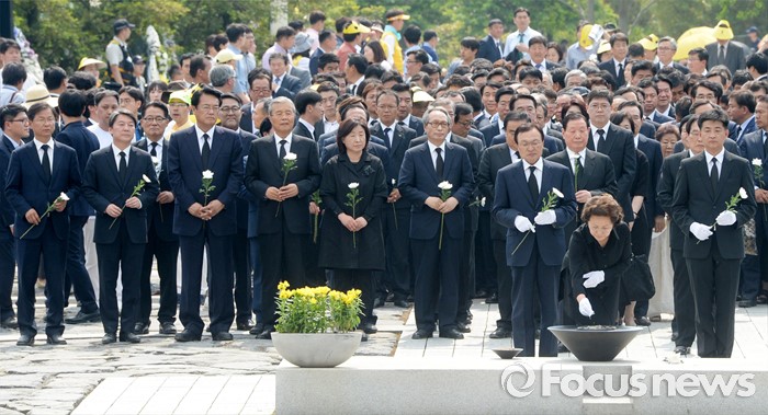 (김해=포커스뉴스) 23일 오후 경남 김해 봉하마을에서 엄수된 故 노무현 전 대통령 서거 7주기 추도식을 마친 뒤 노 전 대통령 부인 권양숙 여사가 묘역 참배 및 헌화를 하고 있다.
