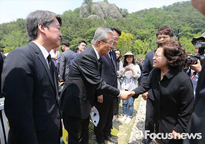 (김해=포커스뉴스) 23일 오후 경남 김해 봉하마을에서 엄수된 故 노무현 전 대통령 서거 7주기 추도식에 참석한 노 전 대통령 부인 권양숙(오른쪽 첫번째) 여사와 김종인(왼쪽 두번째) 더불어민주당 비대위 대표가 인사하고 있다.