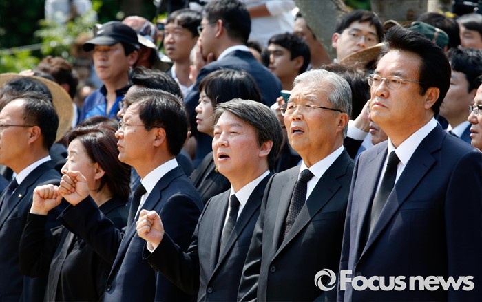 (김해=포커스뉴스) 23일 오후 경남 김해 봉하마을에서 엄수된 故 노무현 전 대통령 서거 7주기 추도식에 참석한 내빈들이 임을 위한 행진곡을 부르고 있다. 앞줄 오른쪽부터 정진석 새누리당 원내대표, 김종인 더불어민주당 비대위 대표, 안철수 국민의당 상임공동대표, 천정배 공동대표, 심상정 정의당 상임대표.
