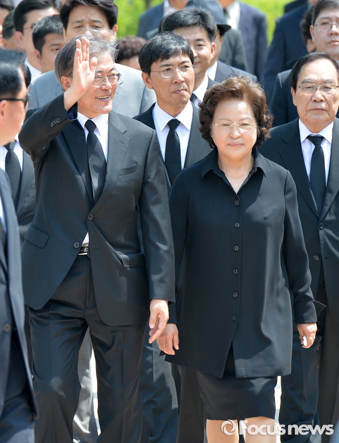 (김해=포커스뉴스) 23일 오후 경남 김해 봉하마을에서 엄수된 故 노무현 전 대통령 서거 7주기 추도식에 노 전 대통령의 부인 권양숙(오른쪽) 여사와 문재인 더불어민주당 전 대표가 참석하고 있다.