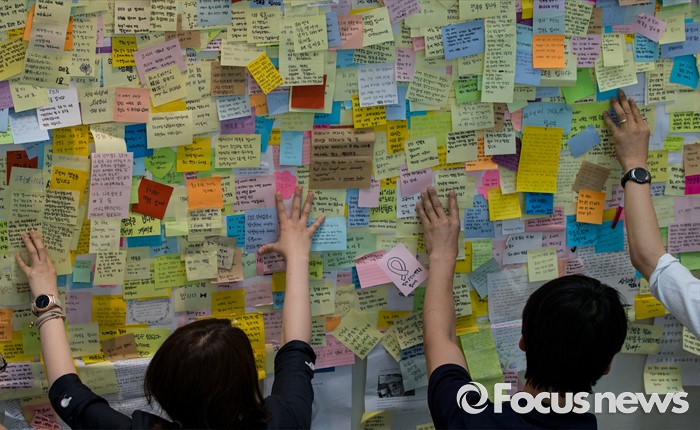 (서울=포커스뉴스) 23일 오후 서울 동작구 서울여성플라자 로비에 마련된 추모 전시장에서 여성가족재단 직원들이 강남역 묻지마 살인 피해자 추모 기록물들을 게시하고 있다.