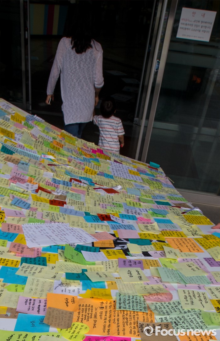 (서울=포커스뉴스) 23일 오후 서울 동작구 서울여성플라자 입구에서 서초구청 및 여성가족재단 직원들이 강남역 묻지마 살인 피해자 추모 기록물들을 전시공간으로 옮기고 있다.