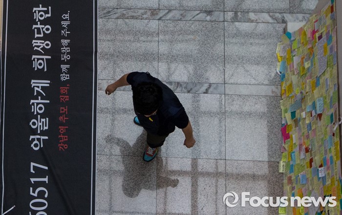 (서울=포커스뉴스) 23일 오후 서울 동작구 서울여성플라자 로비에 마련된 추모 전시장에서 여성가족재단 직원들이 강남역 묻지마 살인 피해자 추모 기록물들을 게시하고 있다.