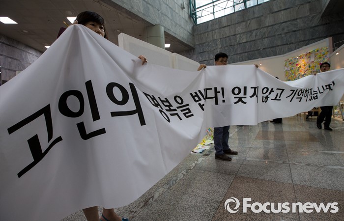 (서울=포커스뉴스) 23일 오후 서울 동작구 서울여성플라자 로비에 마련된 추모 전시장에서 여성가족재단 직원들이 강남역 묻지마 살인 피해자 추모현수막을 펼치고 있다.