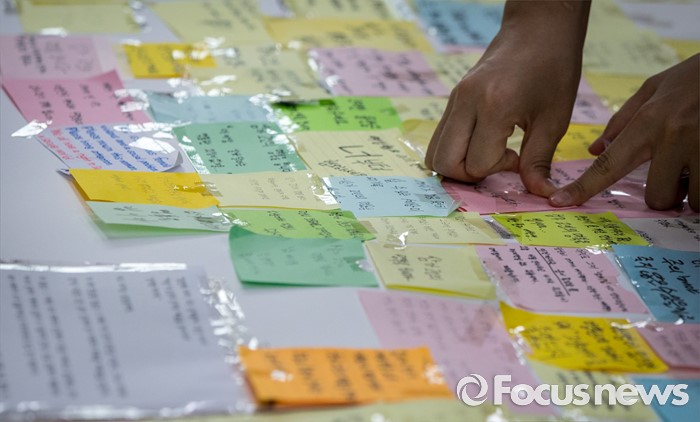 (서울=포커스뉴스) 23일 오후 서울 동작구 서울여성플라자 로비에 마련된 추모 전시장에서 여성가족재단 직원들이 강남역 묻지마 살인 피해자 추모 기록물들을 정리하고 있다.