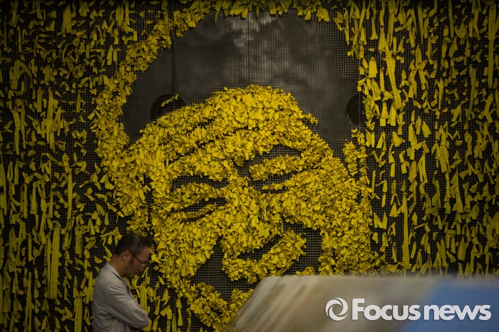 (김해=포커스뉴스)故 노무현 전 대통령 서거 7주기인 23일 오후 경남 김해시 진영읍 봉하마을 '추모의 집'에 노란 꽃으로 수놓은 노무현 전 대통령의 모습이 보이고 있다.