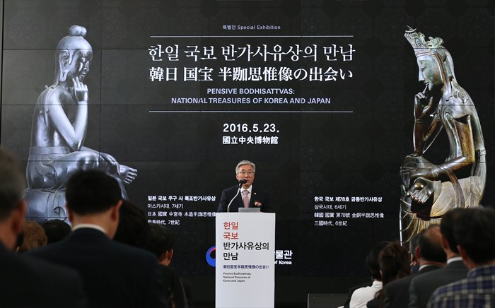 (서울=포커스뉴스) 23일 서울 용산구 국립중앙박물관에서 2015년 한일 국교정상화 50주년을 계기로 기획된 특별전 '한일 국보 반가사유상의 만남' 개막식 행사가 열렸다. 이날 김종덕 문체부 장관이 축사를 하고 있다. <사진제공=문화체육관광부>