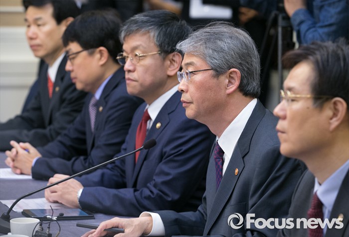 (서울=포커스뉴스) 24일 오전 서울 여의도 국회 귀빈식당에서 열린 조선·해운업 구조조정 관련 당정협의에 참석한 임종룡(오른쪽 두번째) 금융위원장 등 참석자들이 김광림 새누리당 정책위의장의 발언을 듣고 있다. 오른쪽부터 이관섭 산업통상자원부 1차관, 임종룡 금융위원장, 최상목 기획재정부 1차관, 고영선 고용노동부 차관, 정은보 금융위 부위원장.