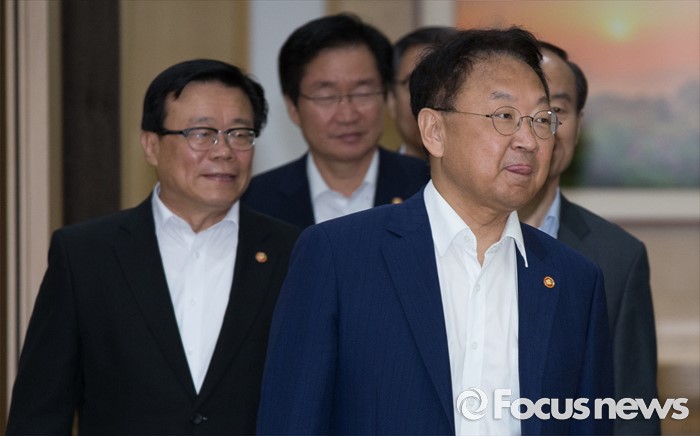 (세종=포커스뉴스) 유일호(오른쪽) 경제부총리 겸 기획재정부장관이 24일 오전 세종시 정부세종청사 국무회의장에서 서울-세종 영상회의로 열린 국무회의에 입장하고 있다.