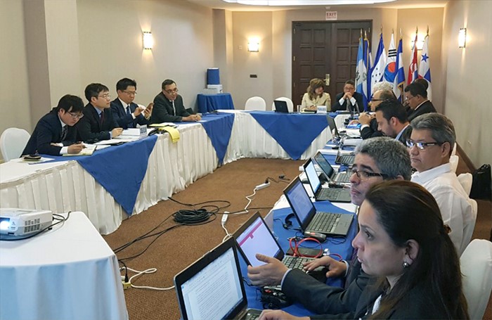 (서울=포커스뉴스) 여한구 산업통상자원부 FTA정책관이 23일(현지시간) 온두라스 수도인 테구시갈파에서 산업부, 기재부, 농축산부, 해수부 등 관계부처로 구성된 정부대표단의 한국측 수석대표로 참석해, 멜빈 E. 레돈도(Melvin E. Redondo) 온두라스 경제통합통상차관을 수석대표로 중미 6개국 정부대표단과'한-중미 FTA 제4차 협상'을 개최하고 있다. <사진제공=산업통상자원부>