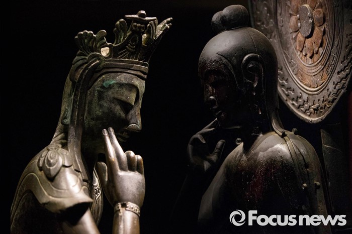 (서울=포커스뉴스) 24일 오전 서울 용산구 국립중앙박물관 기획전시실에서 열리고 있는 '한일국보 반가사유상의 만남' 전시에 우리나라 국보 제78호 금동반가사유상(왼쪽)과 일본의 국보인 나라현 주구사 목조반가사유상이 전시돼있다.