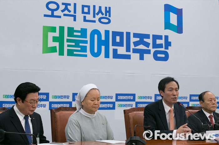 (서울=포커스뉴스) 우상호(오른쪽 두번째) 더불어민주당 원내대표가 24일 오전 서울 여의도 국회에서 이창복(오른쪽 첫번째) 6·15 남측위원회 상임대표의장 등 참석자들과 면담에 앞서 인사말을 하고 있다.