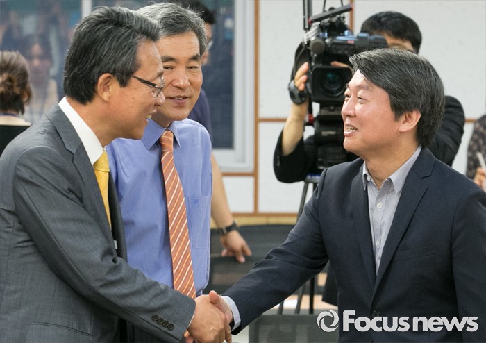 (서울=포커스뉴스) 24일 오전 서울 여의도 국회 의원회관에서 열린 국민의당 6차 정책역량강화 워크숍에 참석한 안철수(오른쪽부터) 상임공동대표와 이상돈 최고위원, 김성식 정책위의장이 인사하고 있다.