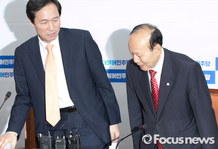 (서울=포커스뉴스) 우상호(왼쪽) 더불어민주당 원내대표가 24일 오전 서울 여의도 국회에서 이창복 6·15 남측위원회 상임대표의장과 면담을 위해 자리에 앉고 있다.