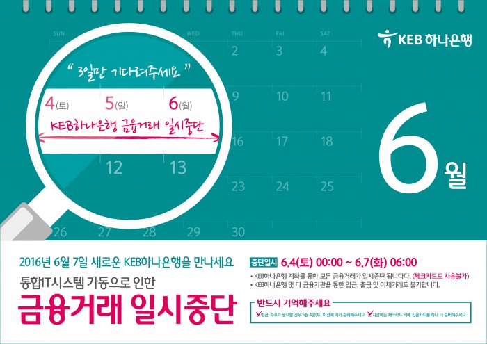 한편, KEB하나은행은 6월4일 자정부터 7일 오전 6시까지 하나은행과 외환은행의 전산시스템 통합작업으로 인해 대부분의 금융거래가 일시 중단된다고 밝혔다.
