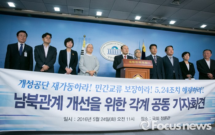(서울=포커스뉴스) 24일 오전 서울 여의도 국회 정론관에서 홍익표 더불어민주당 의원, 이정미 정의당 당선인, 윤종오 무소속 당선인과 6·15 남측위원회 등 각계 종교 및 시민사회 대표들이 남북관계 개선을 위한 공동 기자회견을 하고 있다.