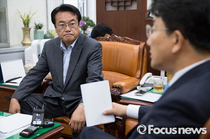 (서울=포커스뉴스) 정진석(왼쪽)새누리당 원내대표와 권성동 환노위 여당 간사가 24일 오전 서울 여의도 국회에서 가습기살균제 피해자와 가족 모임 면담에 앞서 대화하고 있다.