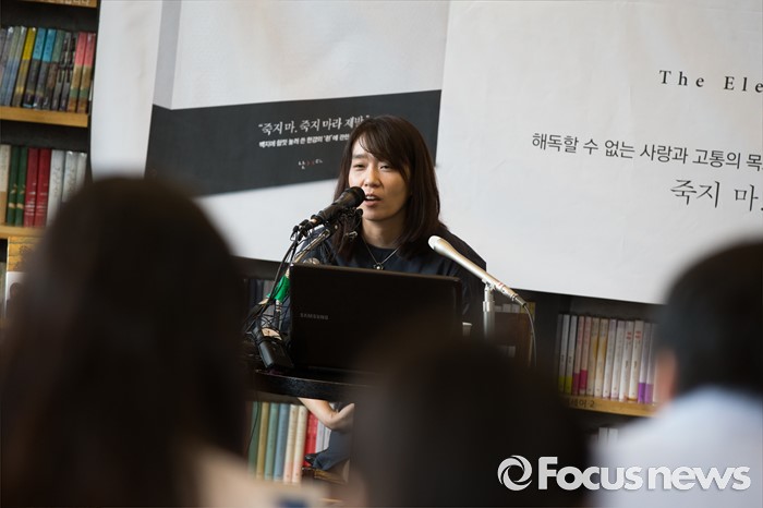 (서울=포커스뉴스) 소설' 채식주의자'로 세계 3대 문학상인 맨부커상을 수상한 한강이 24일 오전 서울 마포구 카페 꼼마에서 열린 신작소설 '흰' 출간 기자간담회에서 취재진의 질문에 답하고 있다.