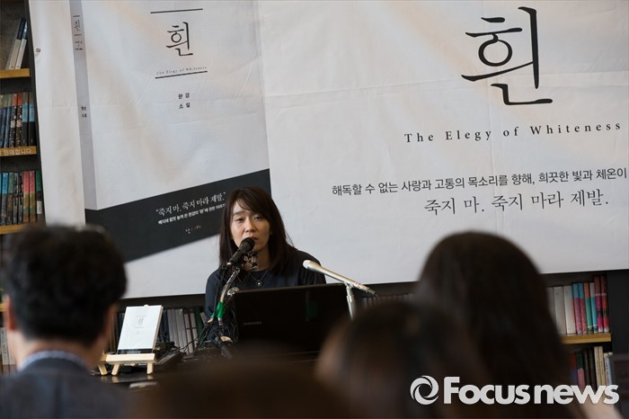 | △ 신작소설 '흰' 출간 간담회 갖는 한강 |