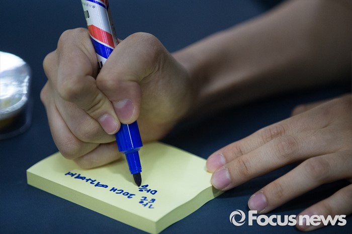 (서울=포커스뉴스) 강남역 인근 주점 화장실 살인사건 피해자 추모 공간이 옮겨진 서울시청 시민청에서 24일 오전 한 시민이 추모 글귀를 적고 있다.