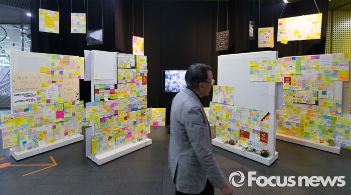 (서울=포커스뉴스) 24일 오전 강남역 인근 주점 화장실 살인사건 피해자 추모 공간이 옮겨진 서울시청 시민청에 추모 쪽지가 전시되어 있다.