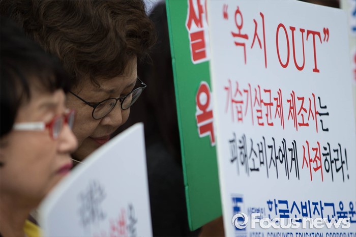 (서울=포커스뉴스) 24일 오후 서울 용산구 이마트 용산역점 앞에서 소비자단체들이 옥시 가습기 살균제 피해에 대한 사과와 보상, 옥시제품 유통업체에서 철수를 촉구하며 기자간담회를 갖고 있다.