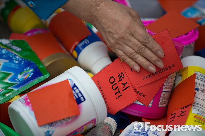 (서울=포커스뉴스) 24일 오후 서울 용산구 이마트 용산역점 앞에서 소비자단체들이 옥시 가습기 살균제 피해에 대한 사과와 보상, 옥시제품 유통업체에서 철수를 촉구하며 옥시제품에 빨간딱지를 붙이는 퍼포먼스를 하고 있다.