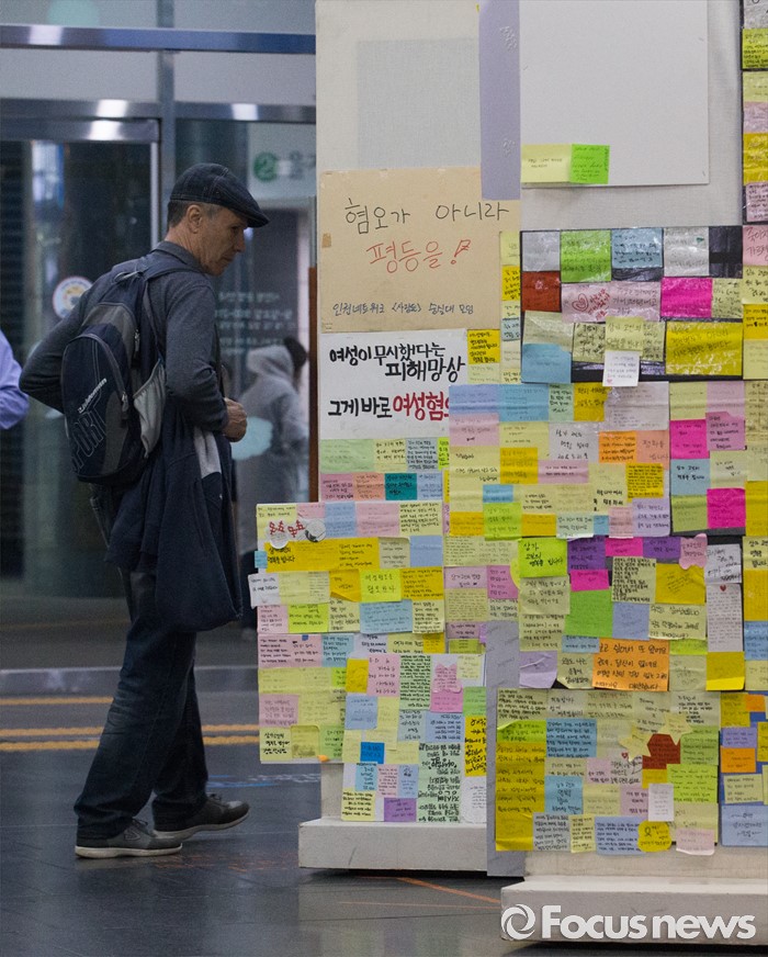 (서울=포커스뉴스) 강남역 인근 주점 화장실 살인사건 피해자 추모 공간이 옮겨진 서울시청 시민청에서 24일 오전 한 외국인이 추모글귀를 살펴보고 있다.
