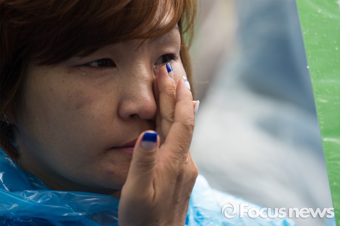 (서울=포커스뉴스) 24일 오전 서울 중구 서울시청 앞에서 열린 '서울시 발달장애인 부모 무기한 삭발결의 선포 기자회견'에 참석한 전국장애인부모연대 회원이 눈물을 닦고 있다.