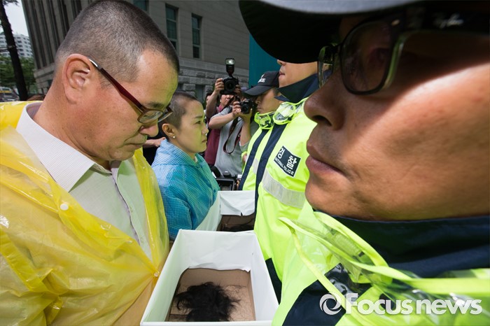 (서울=포커스뉴스) 24일 오전 서울 중구 서울시청 앞에서 열린 '서울시 발달장애인 부모 무기한 삭발결의 선포 기자회견'에 참석한 윤종술(왼쪽) 전국장애인부모연대 대표와 김남연 서울지부장이 삭발한 머리카락을 서울시에 전달하기 위해 정문 앞에서 경찰과 대치하고 있다.