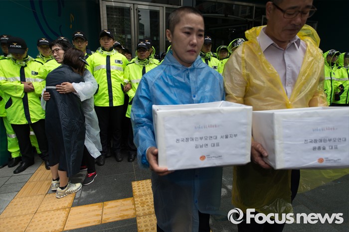 (서울=포커스뉴스) 24일 오전 서울 중구 서울시청 앞에서 열린 '서울시 발달장애인 부모 무기한 삭발결의 선포 기자회견'에 참석한 윤종술(왼쪽) 전국장애인부모연대 대표와 김남연 서울지부장이 삭발한 머리카락을 들고 있다.