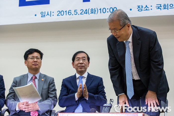 (서울=포커스뉴스) 김종인(오른쪽) 더불어민주당 비상대책위 대표가 24일 오전 서울 여의도 국회의원회관에서 열린 '더불어민주당, 지자체장 초청 일자리 정책 콘서트'에 참석해 발언을 마친 뒤 인사 하고 있다.