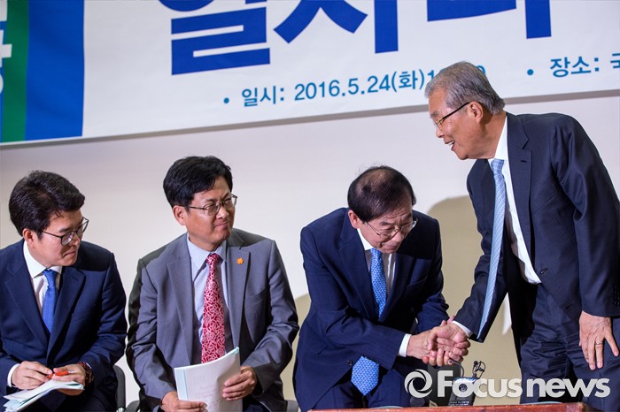 (서울=포커스뉴스) 김종인(오른쪽) 더불어민주당 비상대책위 대표와 박원순(오른쪽 두 번째) 서울시장이 24일 오전 서울 여의도 국회의원회관에서 열린 '더불어민주당, 지자체장 초청 일자리 정책 콘서트'에참석해 악수 하고 있다.