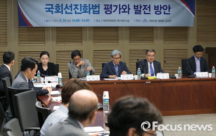 (서울=포커스뉴스) 24일 오후 서울 여의도 국회 의원회관에서 열린 국회선진화법 평가와 발전 방안 토론회에 참석한 패널들이 토론을 준비하고 있다. 왼쪽부터 최정인 국회입법조사처 입법조사관, 박명호 동국대 교수, 정해구 성공회대 교수, 손병권 중앙대 교수, 강원택 서울대 교수.
