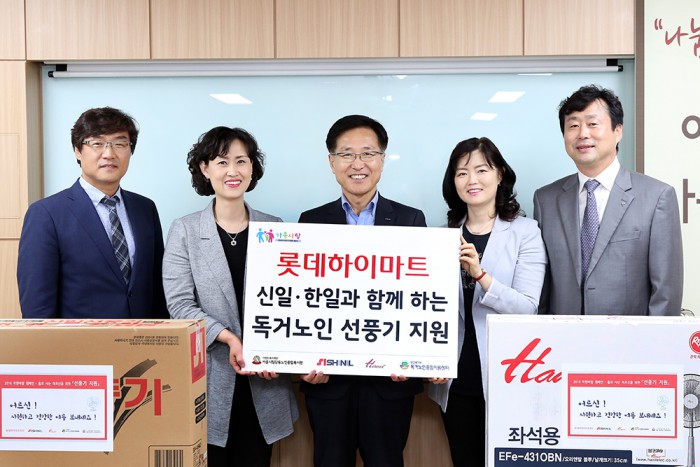 한편, 롯데하이마트는 2014년 6월 보건복지부와 '독거노인사랑잇기사업' 협약을 맺은 바 있다.왼쪽부터 정윤석 신일산업 판매사업본부장, 성미선 강동노인종합복지관장, 롯데하이마트 김현철 상품본부장, 김현미 독거노인종합지원센터 부센터장, 박창진 한일전기 영업본부장 등이 독거노인에 선풍기를 전달한 후 기념촬영하고 있다.<사진제공=롯데하이마트>