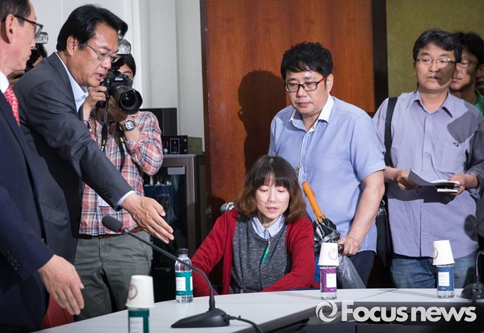 강찬호 '가피모' 대표를 비롯해 지도부를 찾은 이들은 굳은 표정으로 면담장에 들어섰다. 산소호흡기를 착용하고 휠체어를 탄 여성 피해자는 울면서 입장했다.