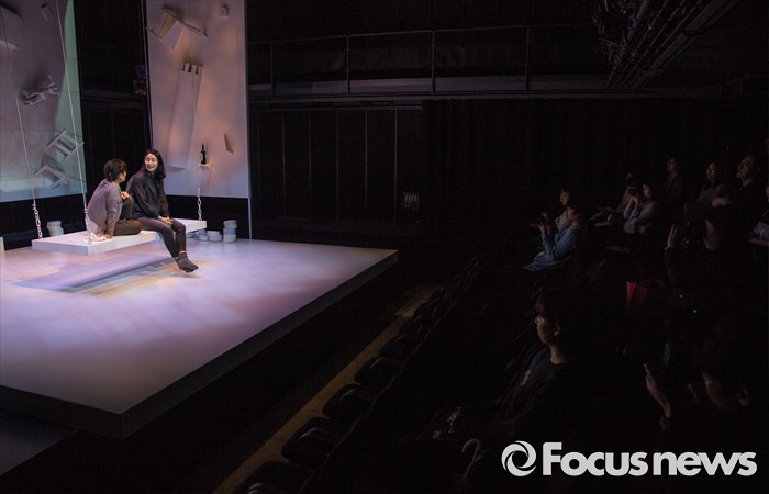 (서울=포커스뉴스) 24일 오후 서울 종로구 CJ아지트 대학로점에서 열린 연극 '크레센도 궁전' 프레스콜에 참여한 배우 강애심(왼쪽)과 김소진이 주요장면을 시연하고 있다.